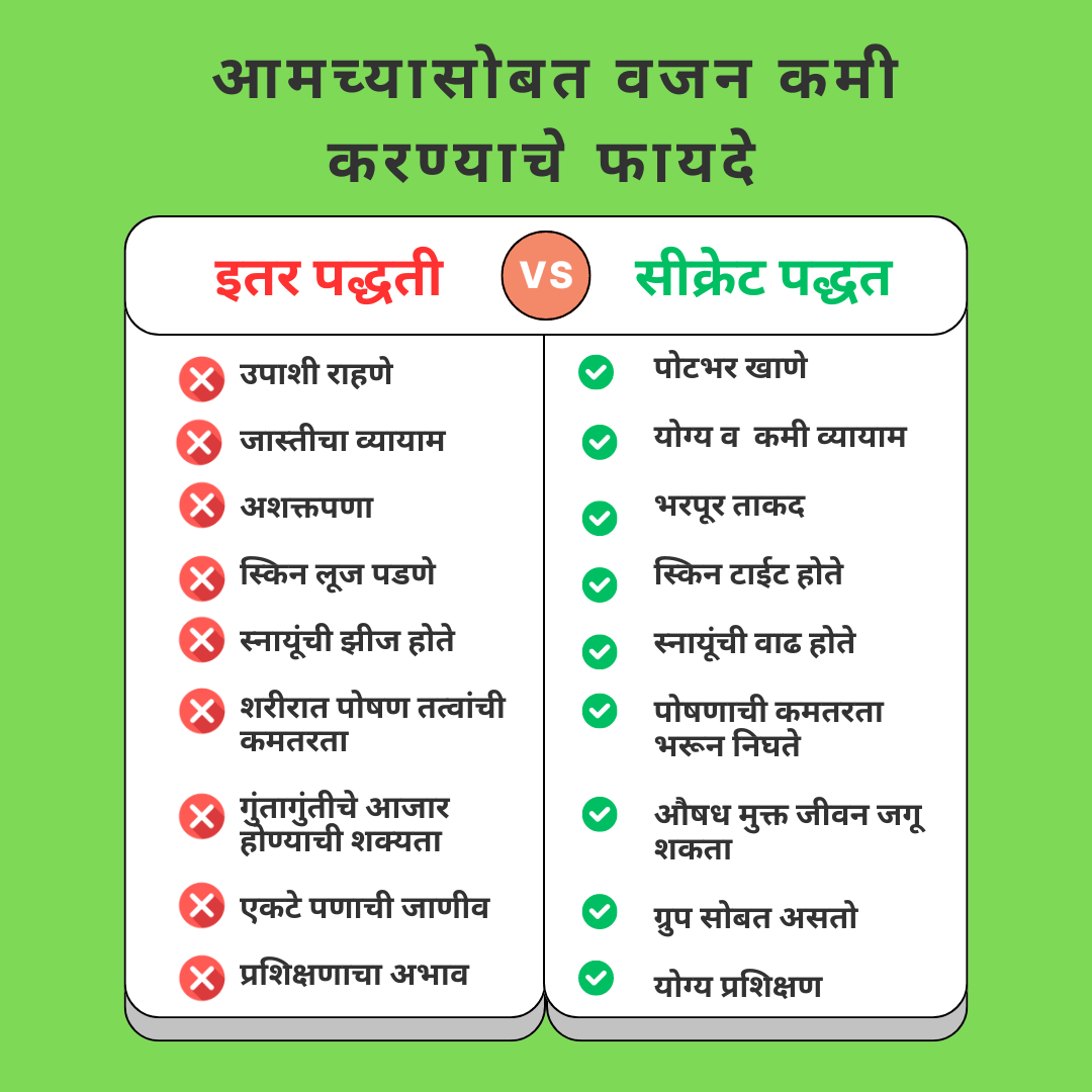 वजन हे अनेक आजारांचे मूळ आहे, त्यामुळे आजारमुक्त व्हायचे असेल तर तुम्हाला वजन कमी करणे गरजेचे आहे, भविष्यात गोळी औषधें आणि हॉस्पिटल ची वारी करायची का वजन कमी करायचे हे तुम्ही ठरवा. आम्ही तुमची मदत करायला नेहमीच तत्पर आहोत.
